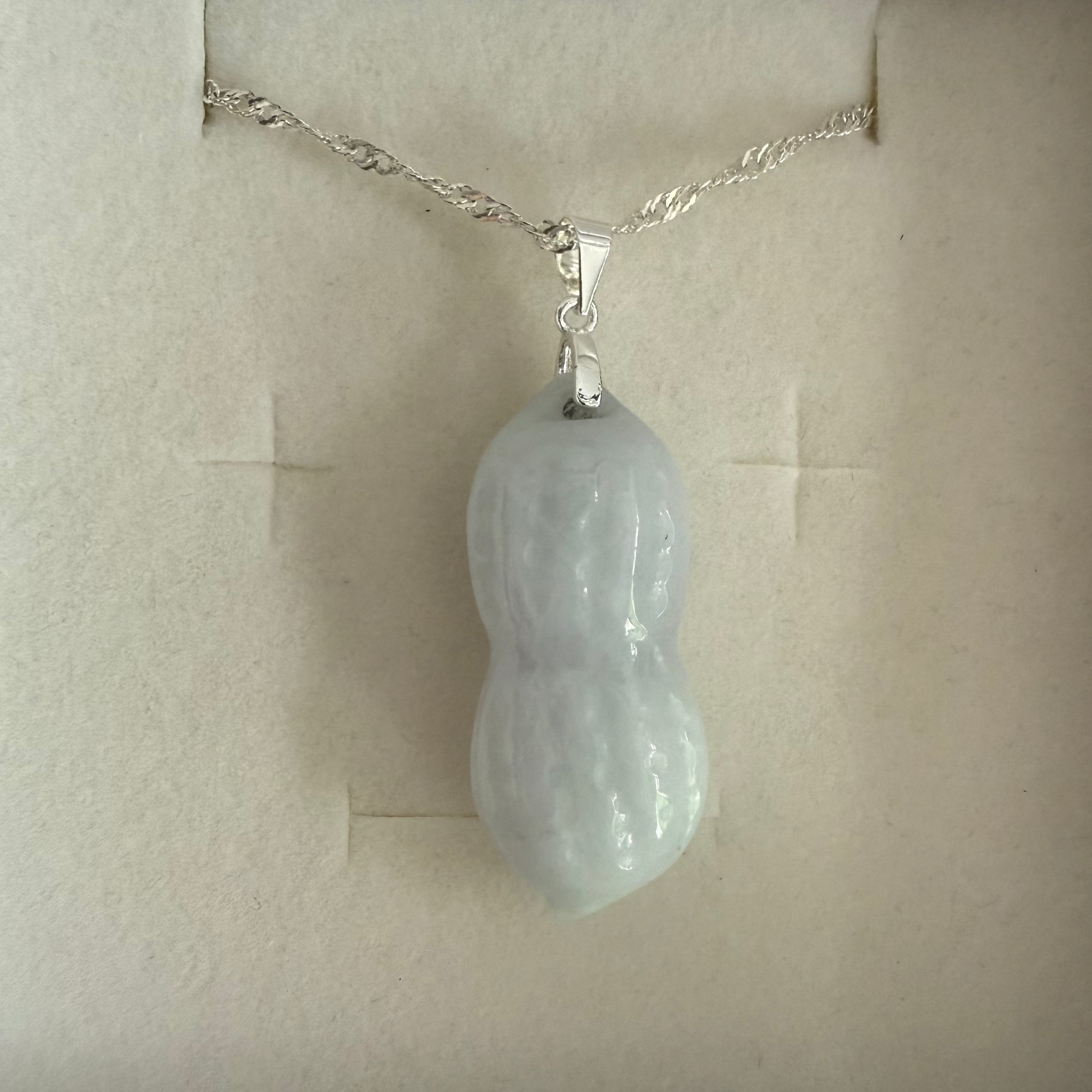 Celebrate abundance and lasting bonds with this White Jadeite Peanut Pendant, elegantly suspended on a sleek silver chain. The milky white jadeite glows with soft luminosity, while the modern silver setting creates a refined contrast that honors both tradition and contemporary style.