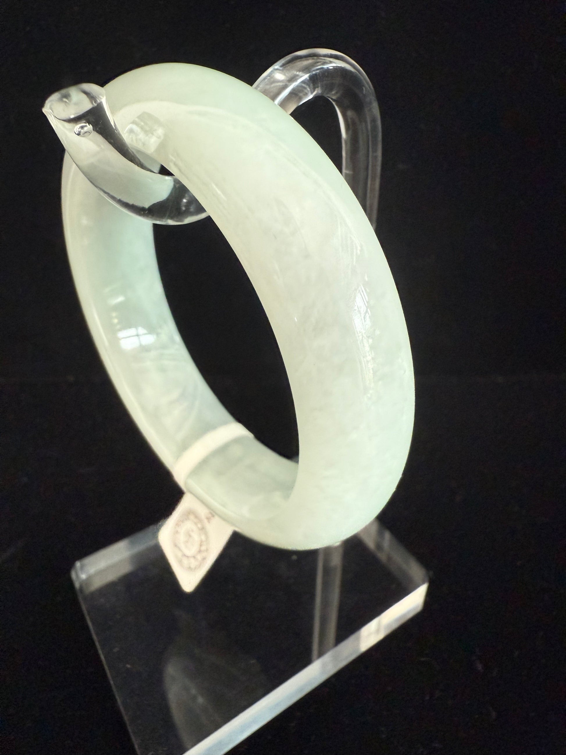 “A luminous jadeite bangle in uniform light green tones, radiating calm elegance and natural purity. Its smooth, glossy finish enhances the stone’s gentle glow, creating a timeless accessory that embodies jade’s harmony and authenticity. Perfect for everyday wear or as a treasured addition to any collection.”
