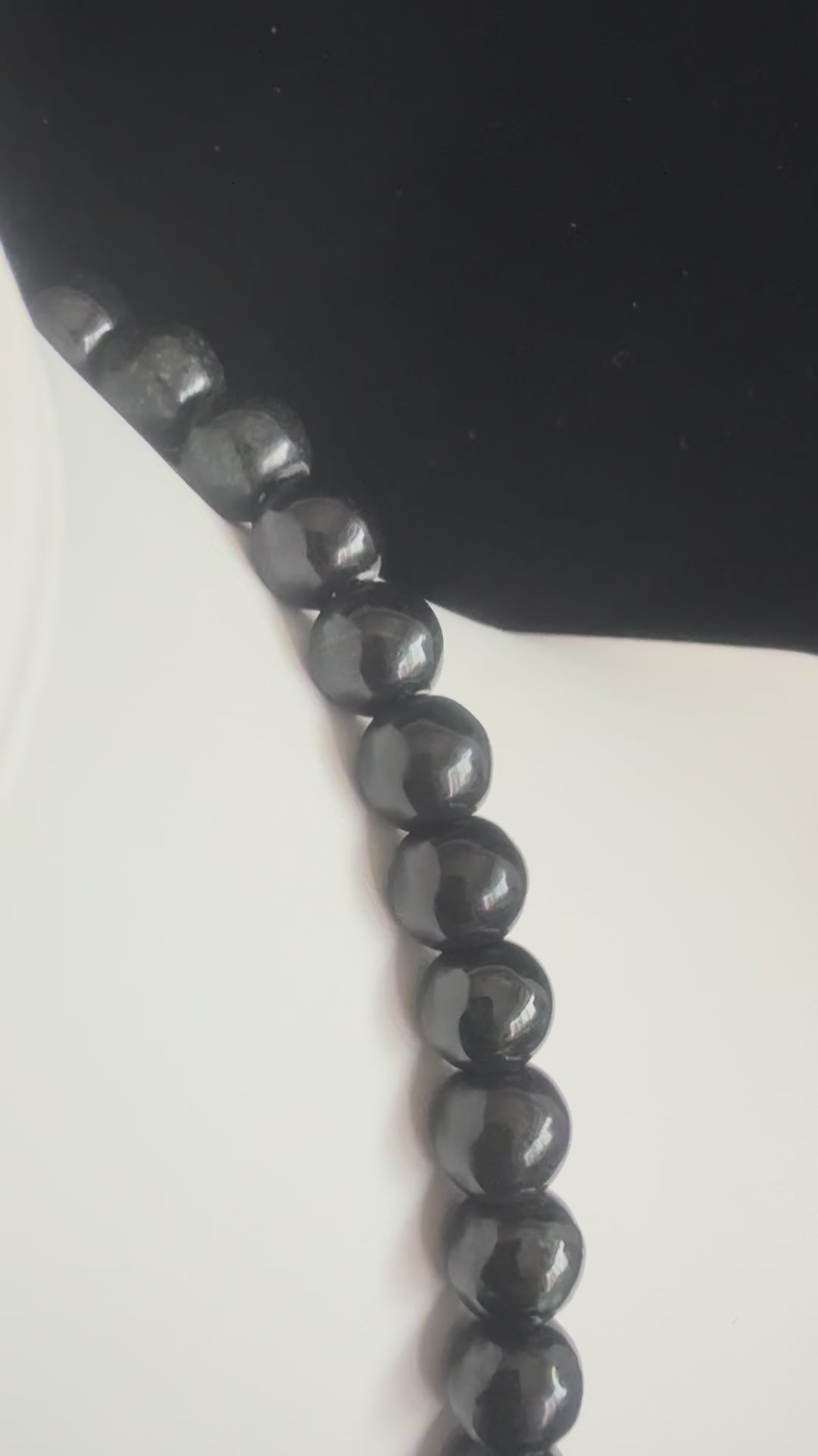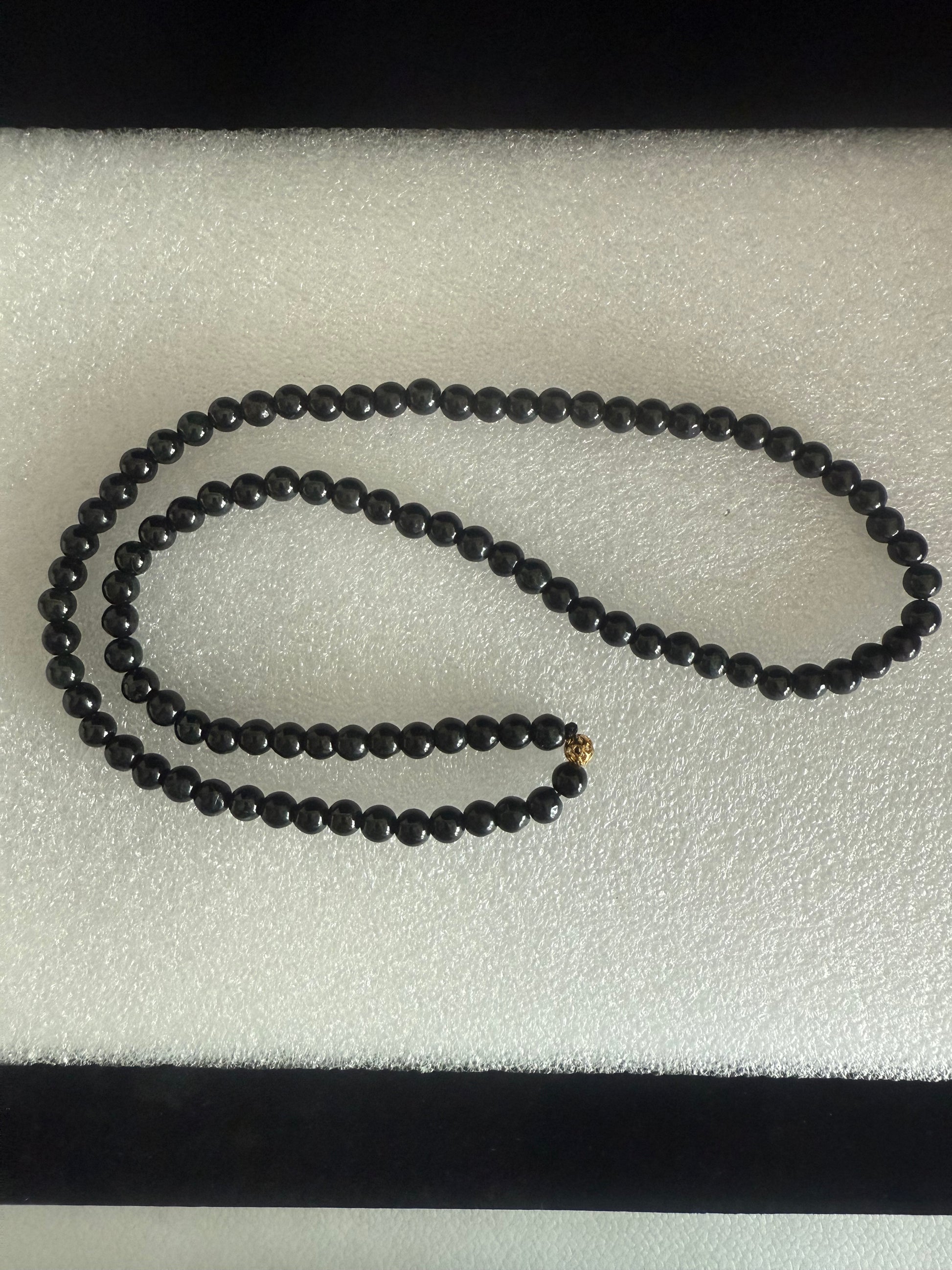 Crafted from genuine black jadeite stones, this necklace features smooth beads that radiate a deep, mysterious elegance. The rich black tones carry subtle natural variations, affirming the authenticity of the jade and adding quiet depth to its appearance. Each bead reflects both the artisan’s workmanship and the inherent qualities of the stone, resulting in a piece that is refined yet enigmatic. Worn alone, it conveys understated sophistication; layered, it becomes a bold statement of strength and mystery.