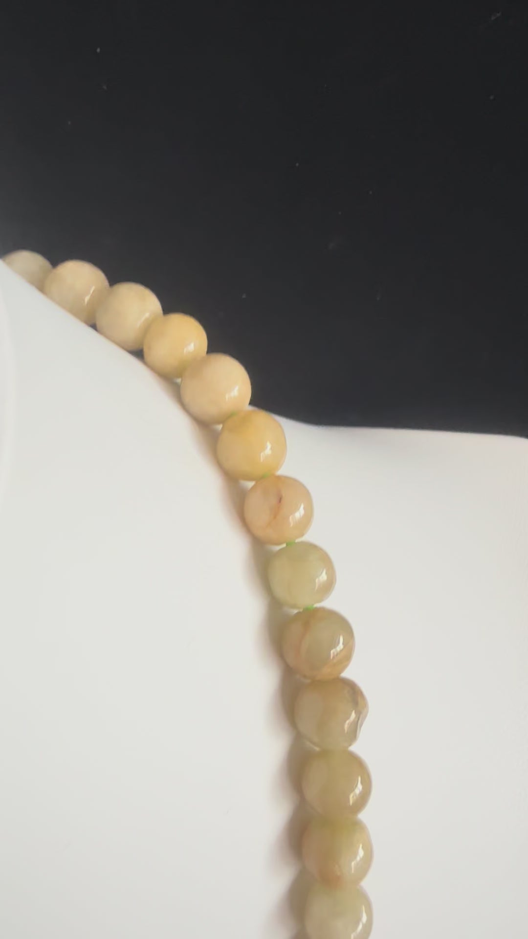 This yellow jade bead chain glows with warm golden tones, each bead shaped by hand and nature itself. Not all beads are perfectly round—subtle irregularities in form and surface reflect both the artisan’s workmanship and the inherent character of genuine jade. These variations, along with natural inclusions and tonal shifts, ensure that every necklace is unique, carrying the authentic beauty of stone shaped by earth and craft.