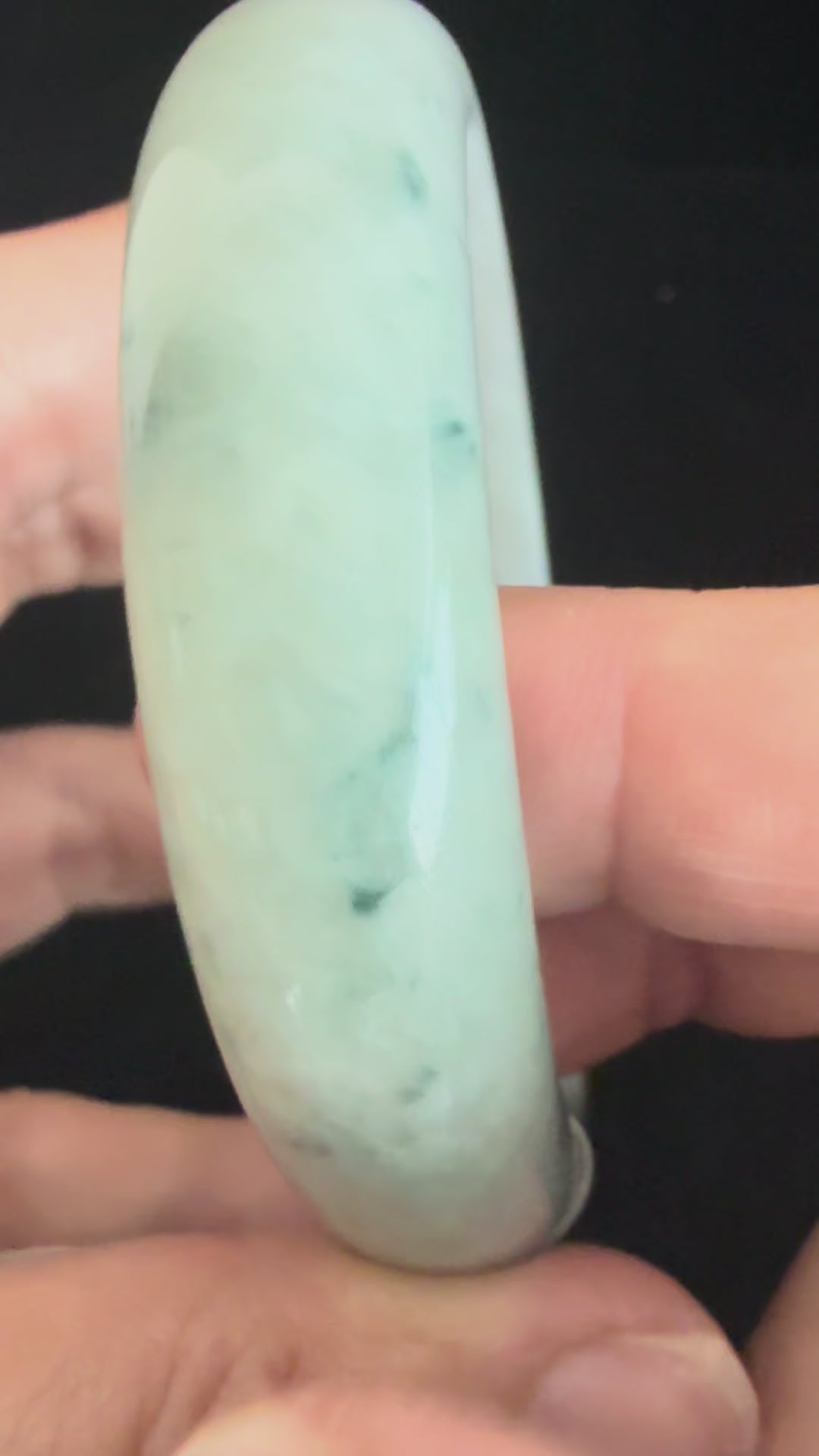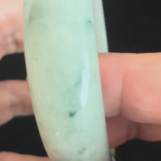 “A luminous jadeite bangle featuring green floating speckles that dance across a unique blend of half light‑green and half icy‑white tones. Its glossy, icy finish enhances the stone’s natural translucence, creating a striking harmony between freshness and purity. Authentic and refined, this bangle embodies jade’s timeless elegance with a touch of ethereal charm.”
