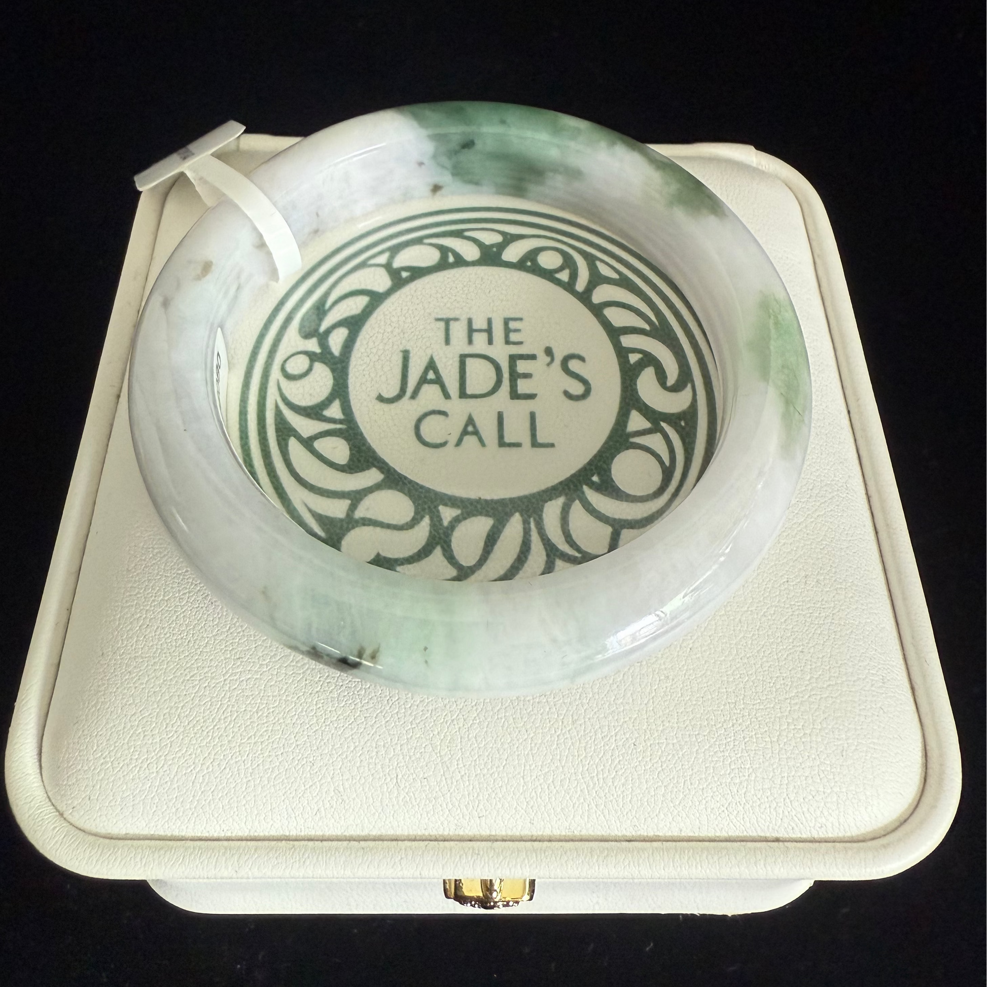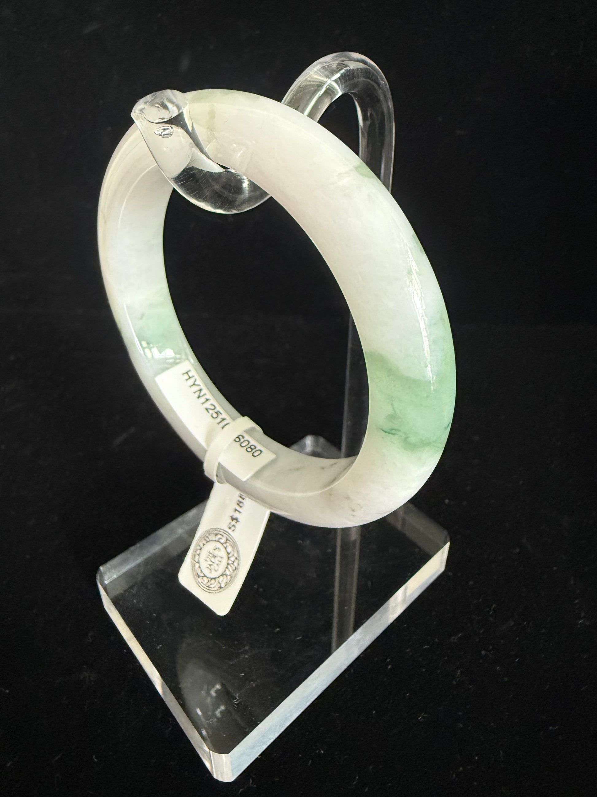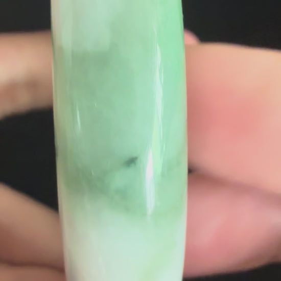 このバングルは、白いベースに柔らかなグリーンのオーバーレイ、そして印象的なダークグリーンのスプラッシュが施されています。滑らかな研磨が施され快適な着け心地のこの本物の翡翠は、純粋さと鮮やかな個性を絶妙にバランスさせ、コレクターの方にも、日常のエレガンスにもぴったりの、時代を超越したアクセサリーです。