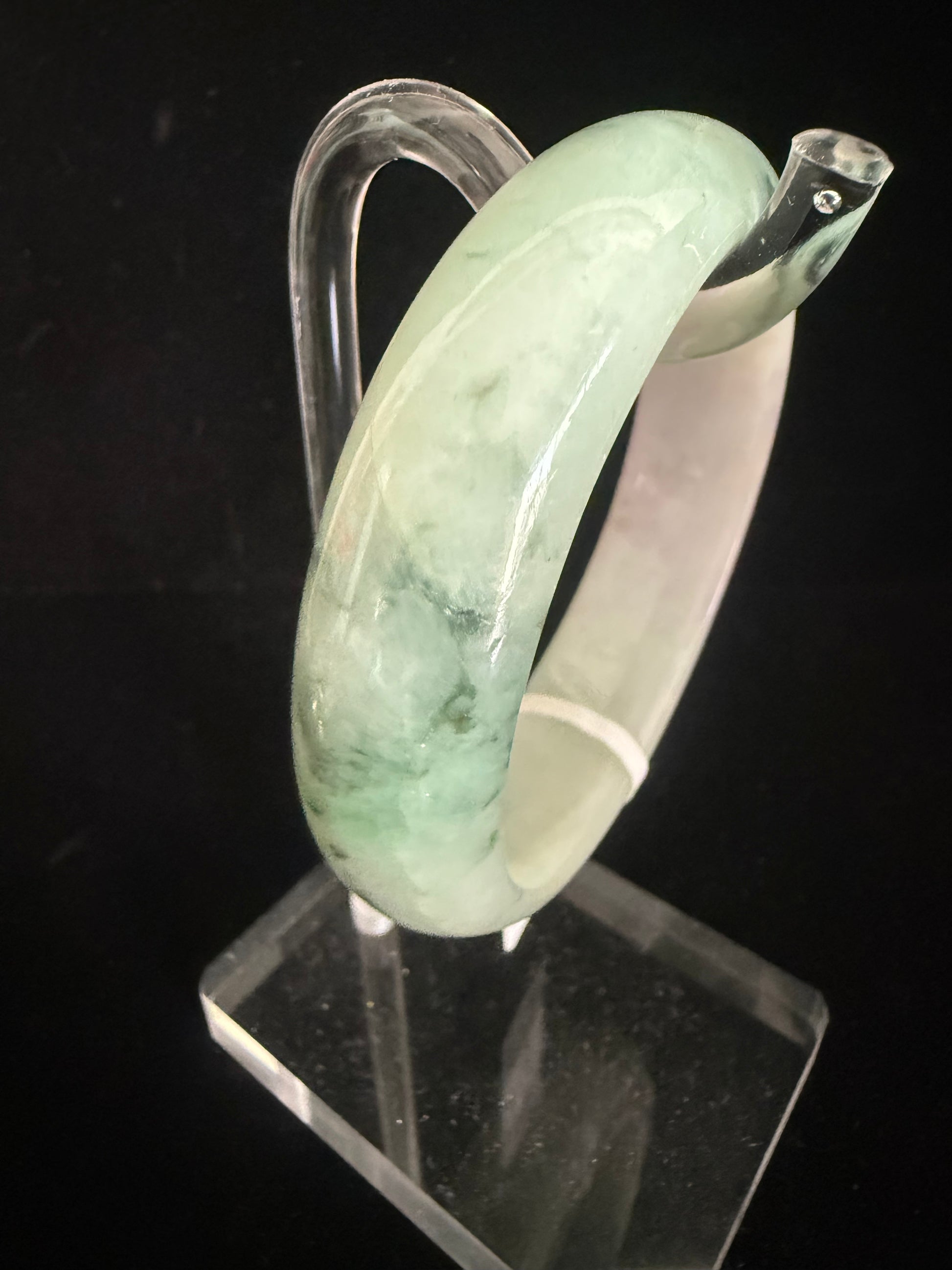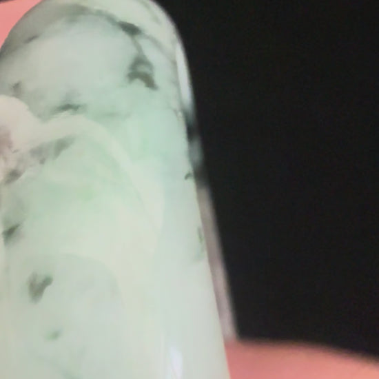 A mesmerizing jadeite bangle with a soft green and lavender base beautifully intertwined with natural pattern of floating flowers. The gentle transition of colors creates a harmonious, organic design that feels both elegant and alive. Slightly broader and smoothly polished, this piece glows with subtle luminosity, making it a timeless treasure for everyday wear or collection.