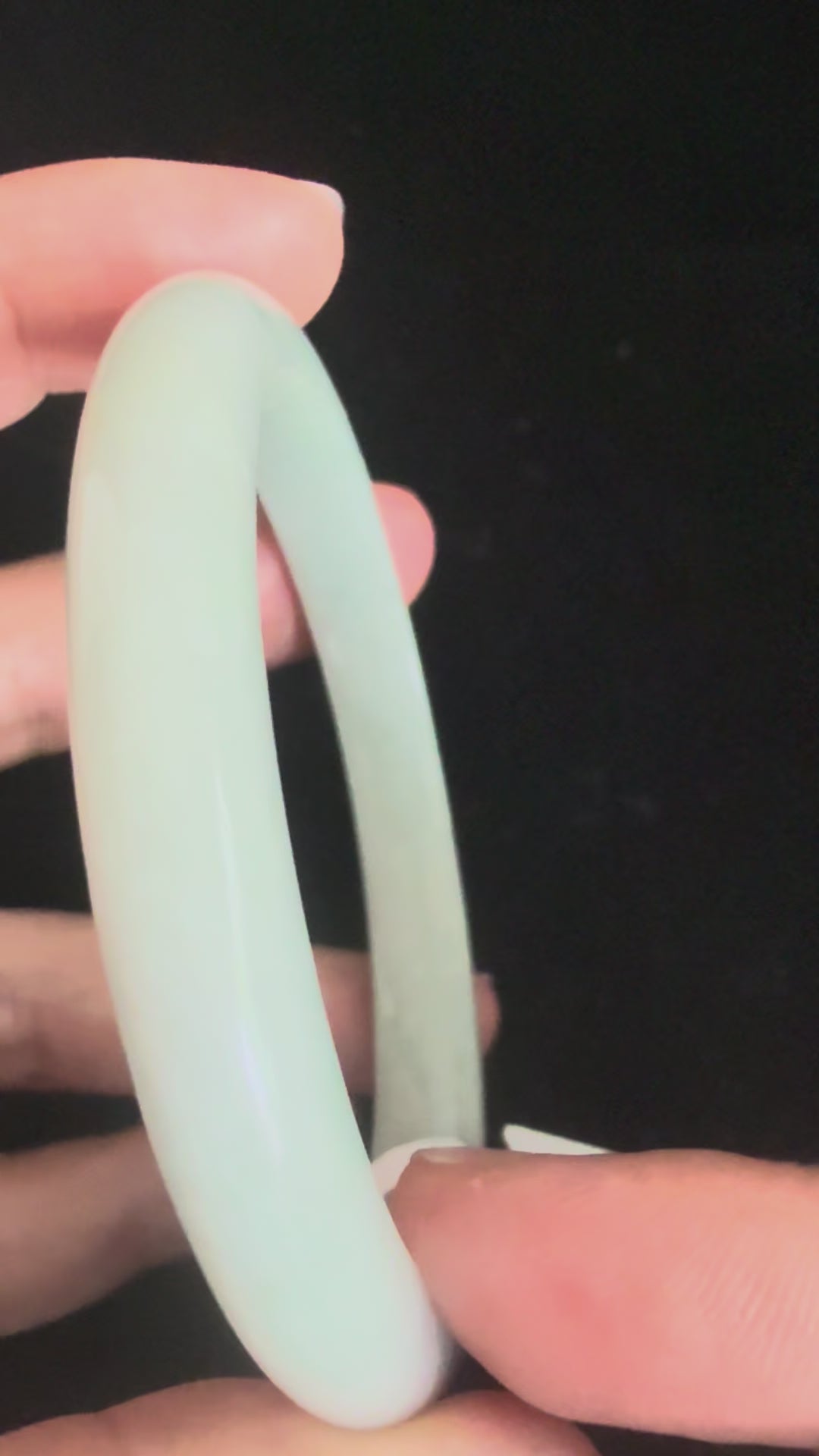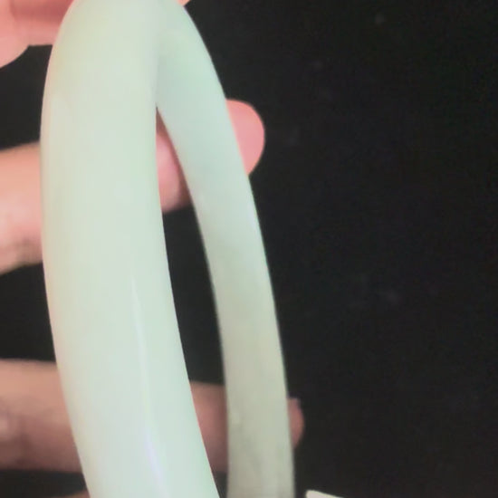This jadeite bangle is slim and dainty, crafted in light green tones that evoke freshness and serenity. Its glossy polish enhances the natural translucence, giving it a refined, elegant presence. Subtle yet sophisticated, it’s a graceful accessory that embodies understated beauty.