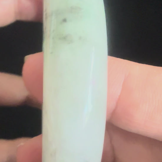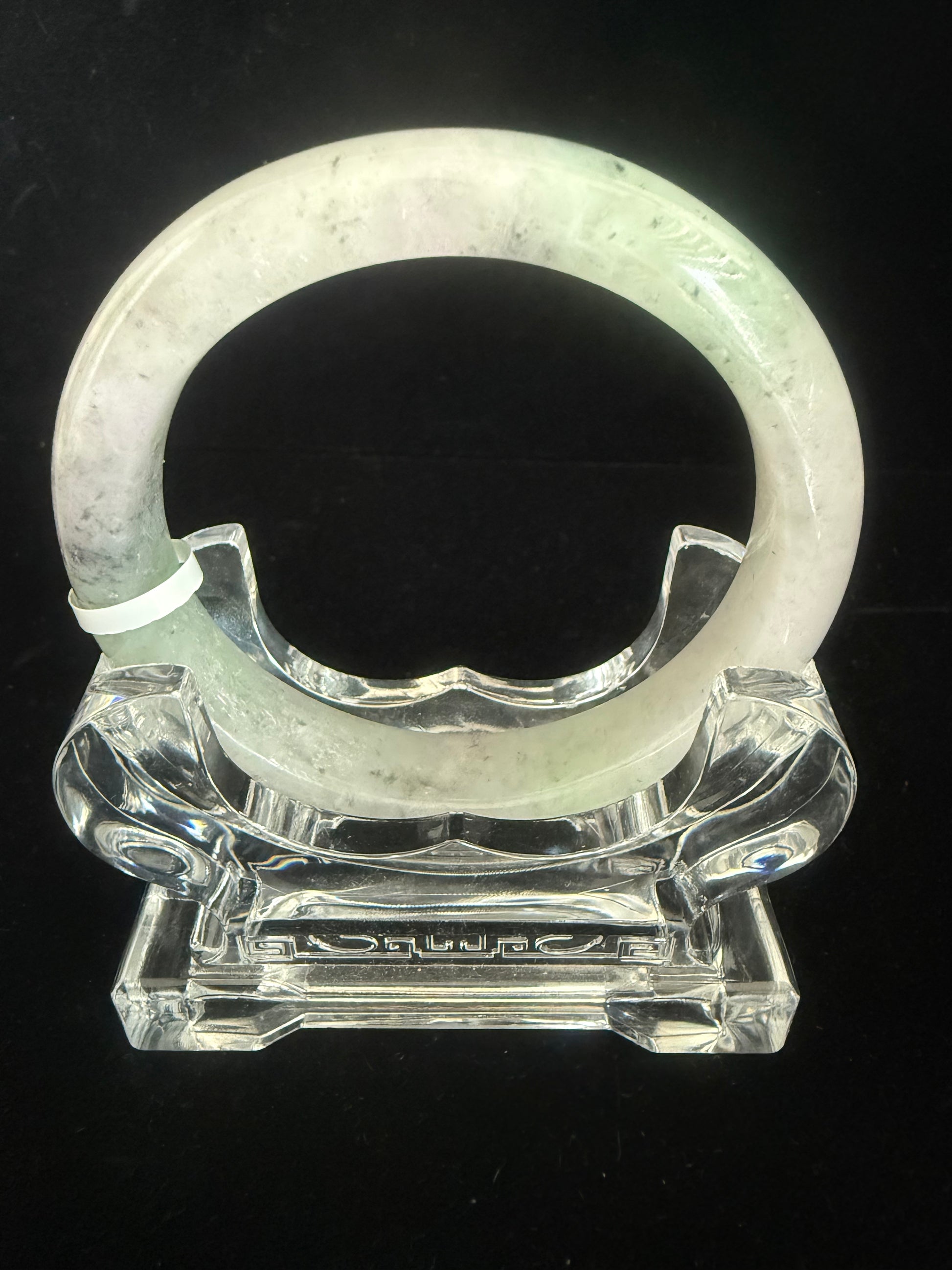 This jadeite bangle shows a graceful base of lavender blending into soft green, naturally sprinkled with tiny black mineral dots that affirm its authenticity. The smooth polish highlights these organic details without hiding them, giving the piece a youthful, honest character. Elegant yet understated, it carries jade’s timeless symbolism of harmony and vitality while celebrating the stone’s raw beauty.