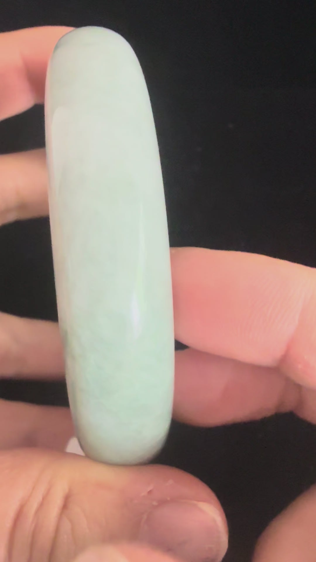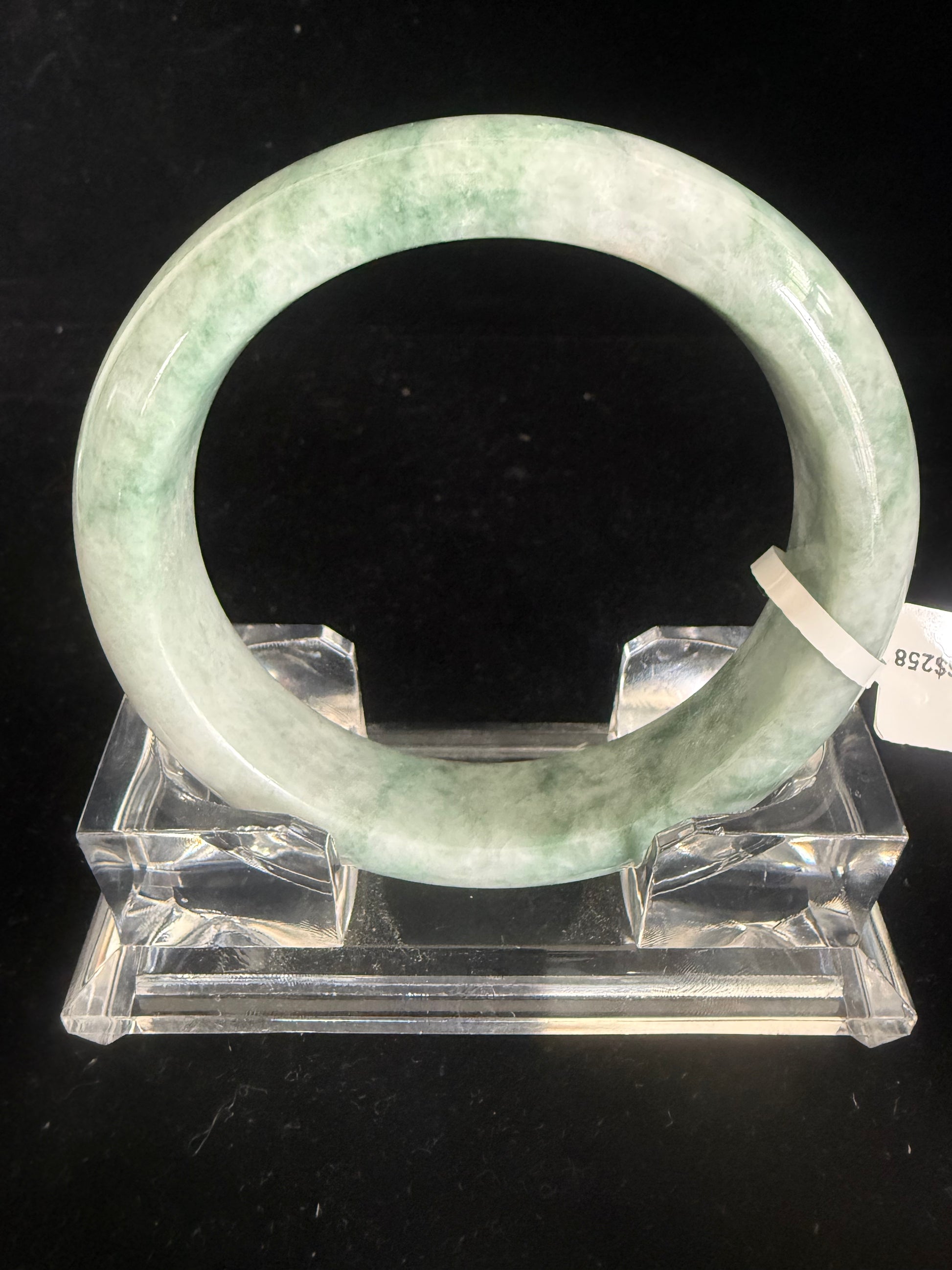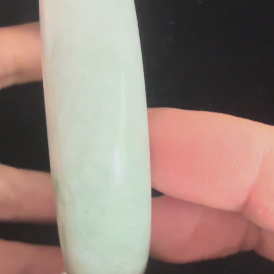 This jadeite bangle carries a greyish-green mix, with a natural spread of green patterns flowing across its surface. The interplay of hues gives it a commanding presence—organic yet dignified. Its substantial size and weight make it feel big and powerful, a statement piece that conveys both natural authenticity and quiet status.