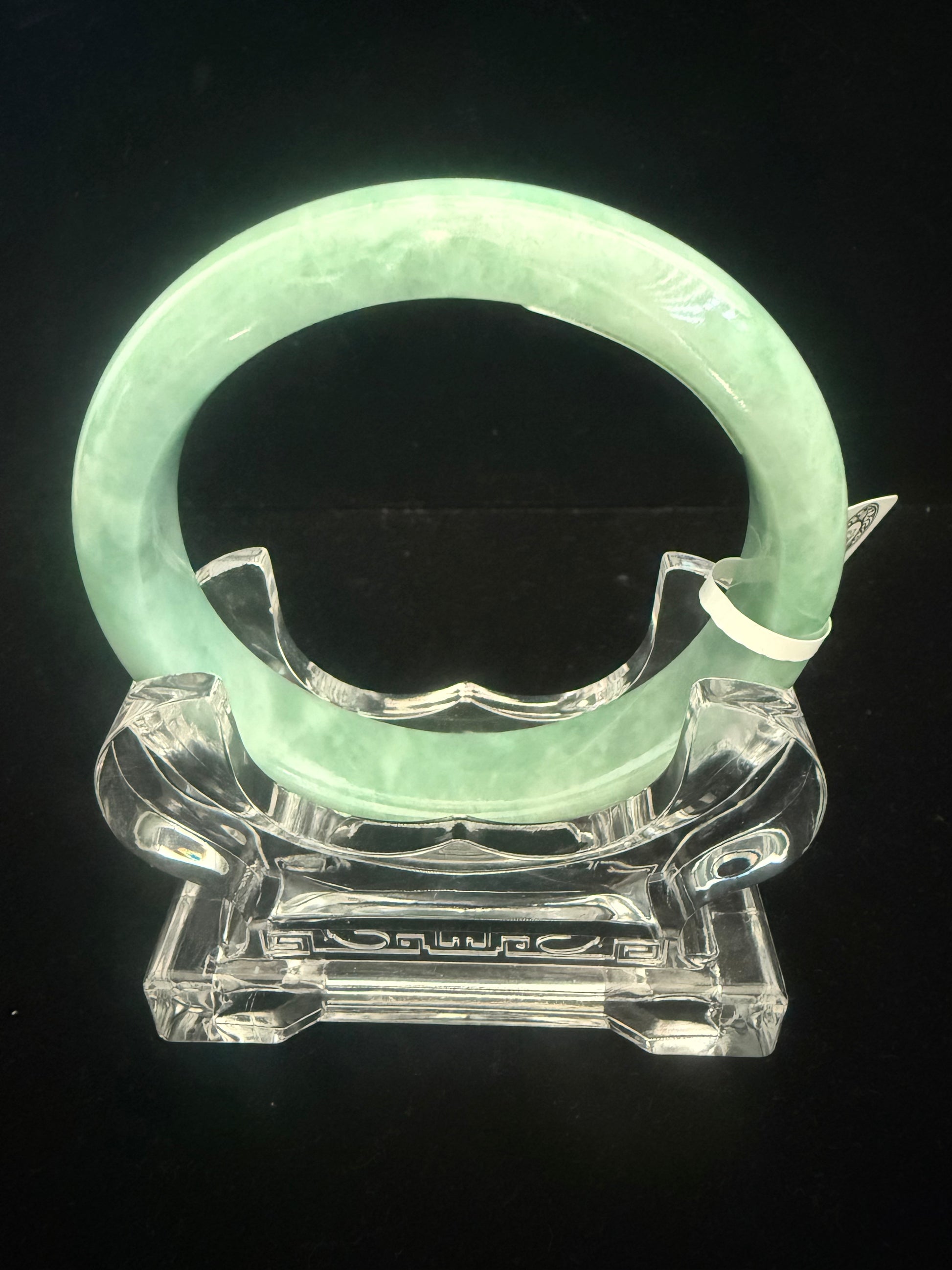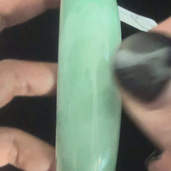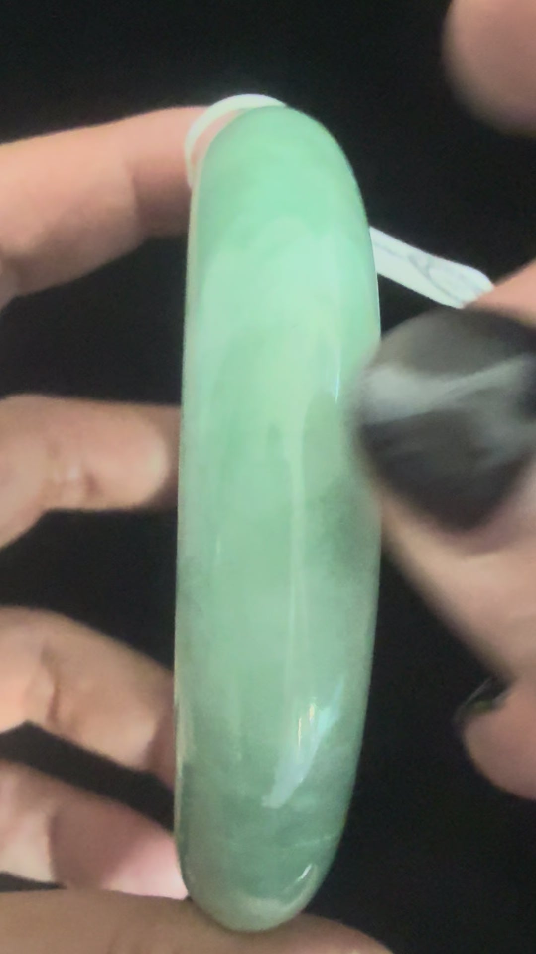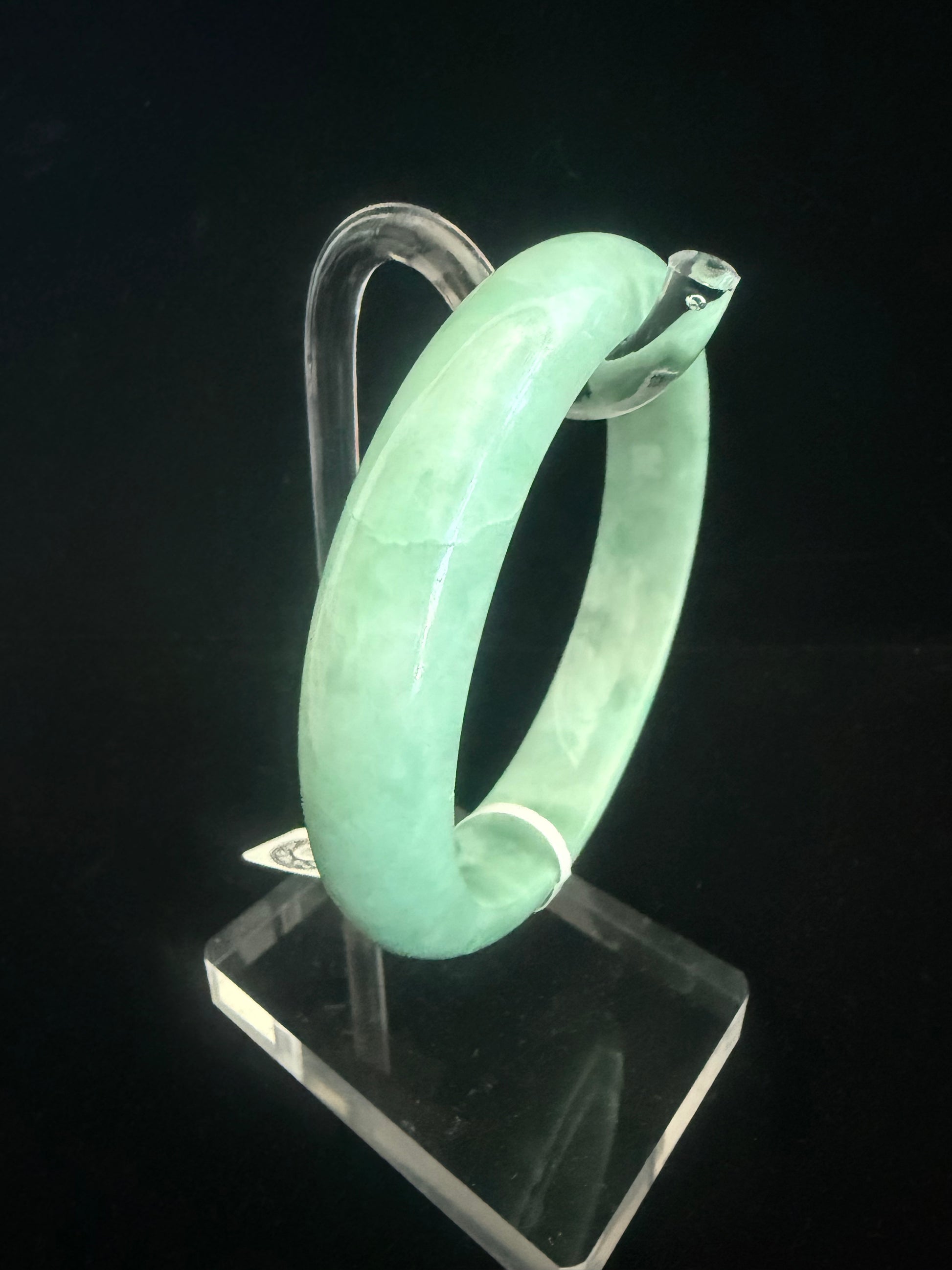 This jade bangle showcases a vibrant, natural green color that stands out beautifully. It is one of the larger sizes available in our store, offering a bold and elegant look. Very fine hairline inclusions can be seen upon close inspection, highlighting the authenticity and natural formation of the stone. A perfect choice for those who appreciate genuine jade with a lively, eye-catching hue.