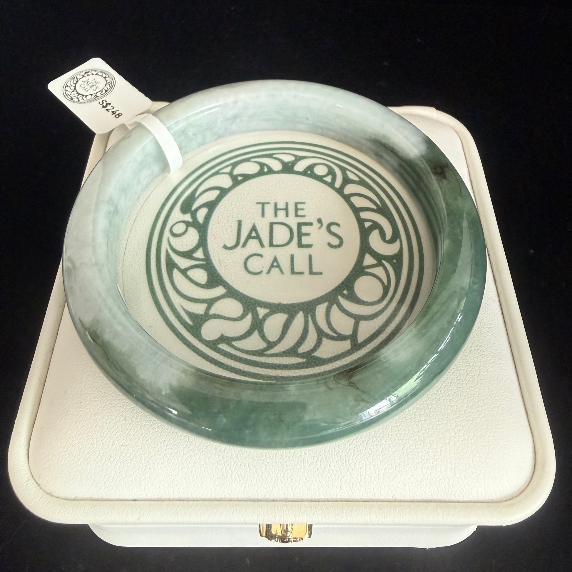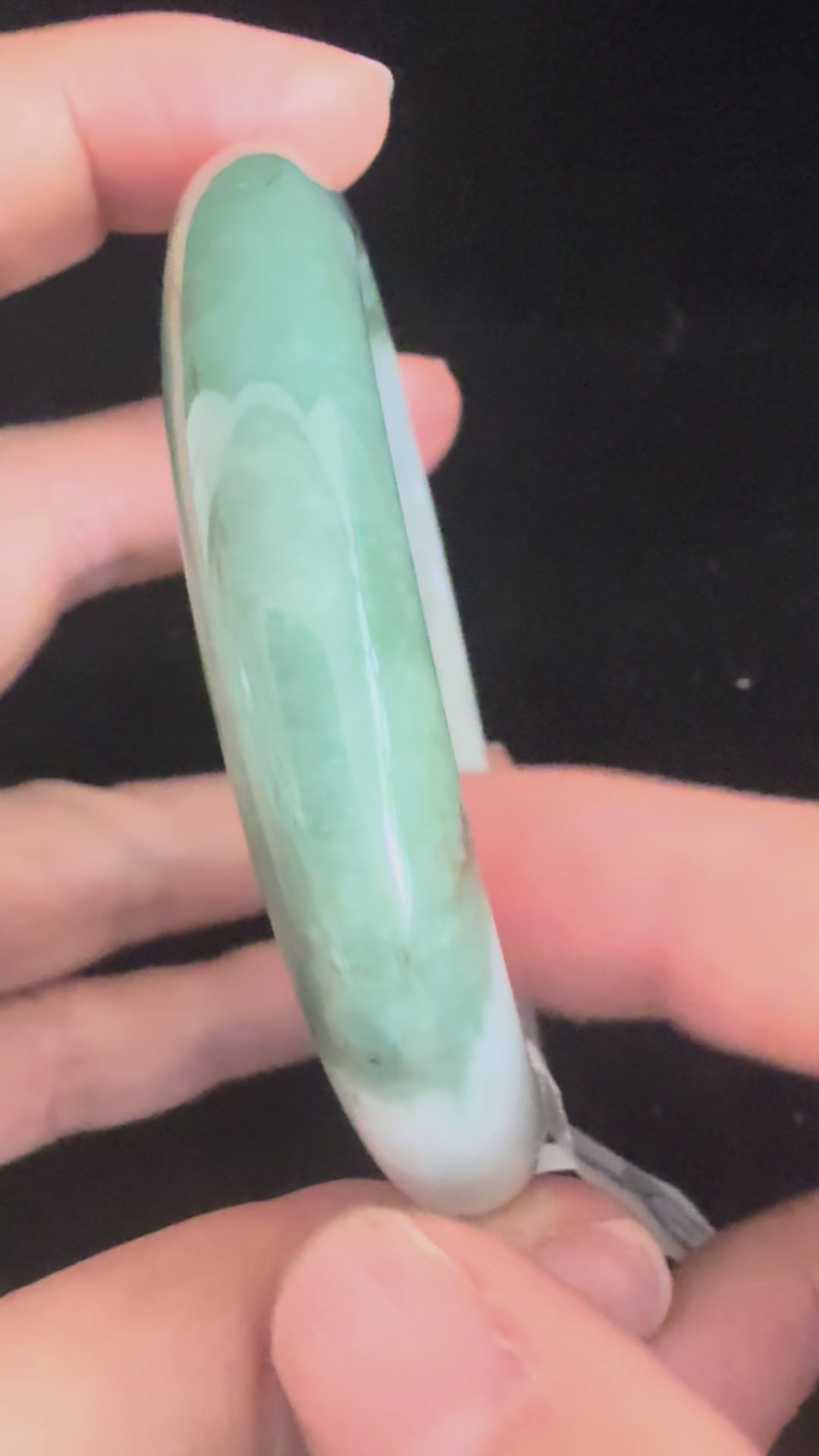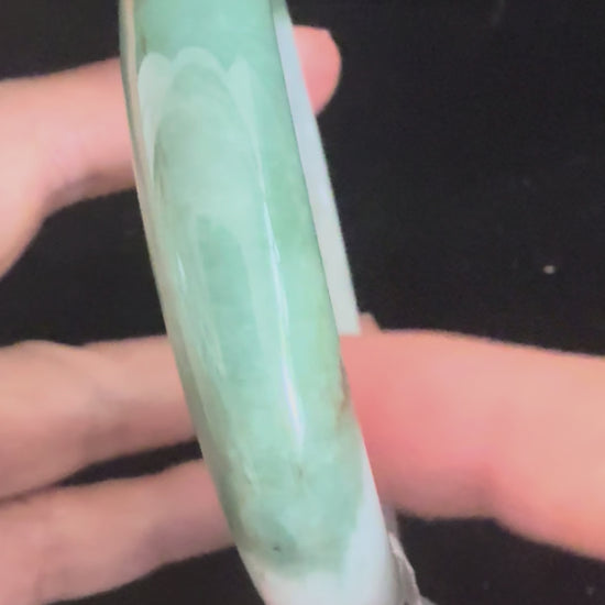 This jadeite bangle is uniquely formed with half in darker green and the other half in lighter green, creating a striking contrast within a single piece. When worn, it can be turned to reveal two distinct vibes—one bold and commanding, the other soft and serene. Its polished finish enhances the interplay of colors, making it both versatile and captivating.