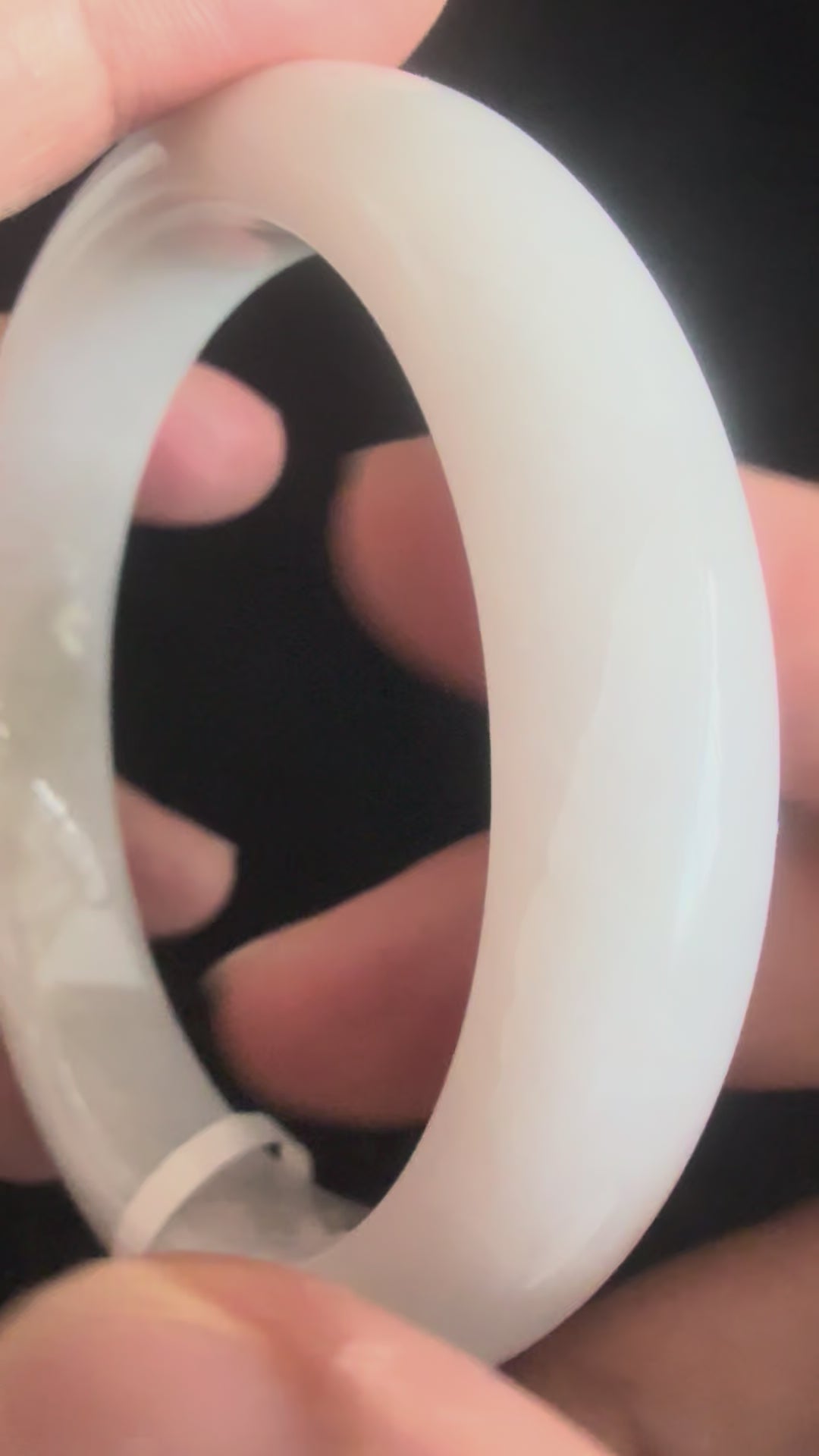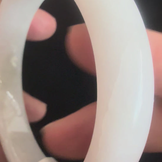 This jadeite bangle has a clean white base accented with natural stone lines that affirm its authenticity. The smooth polish highlights the subtle textures without hiding them, giving the piece a quiet elegance. Simple yet distinctive, it reflects jade’s timeless symbolism of purity, harmony, and strength while celebrating the stone’s natural character.
