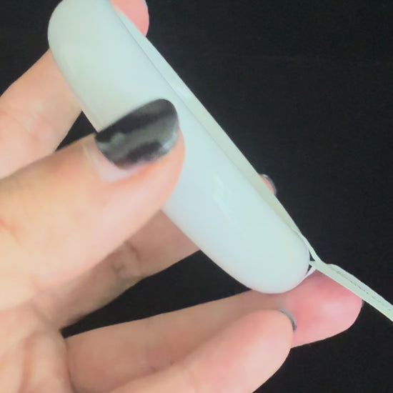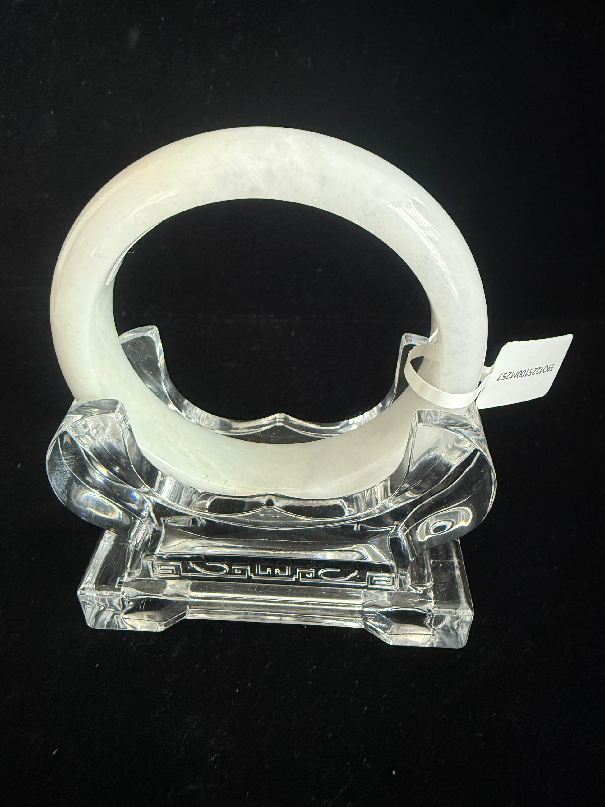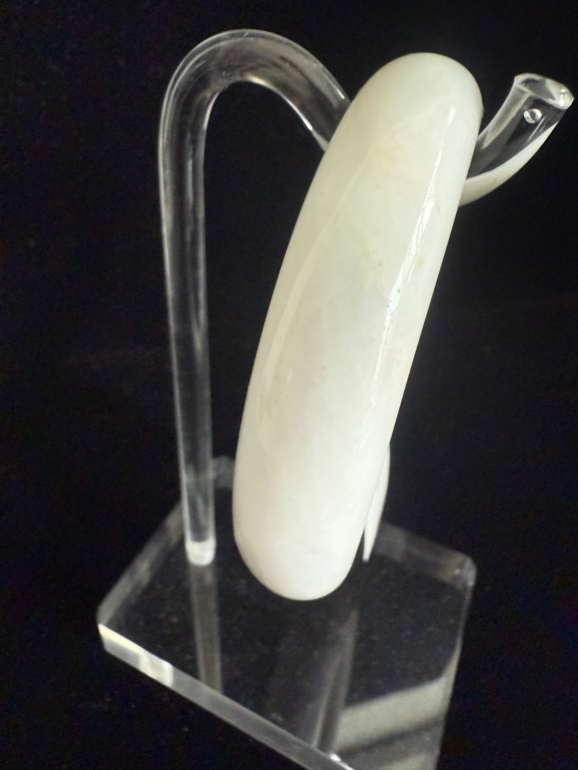 This smooth white moonlight bangle glows with a soft, luminous sheen, its polished surface reflecting a serene elegance. What makes it truly distinctive is the presence of a unique natural pit, a subtle mark formed during its creation that adds authenticity and character to the piece. The gentle white tone, paired with its flawless curves, gives the bangle a calm, ethereal beauty — a refined accessory that celebrates both purity and the natural imperfections that make it one‑of‑a‑kind.