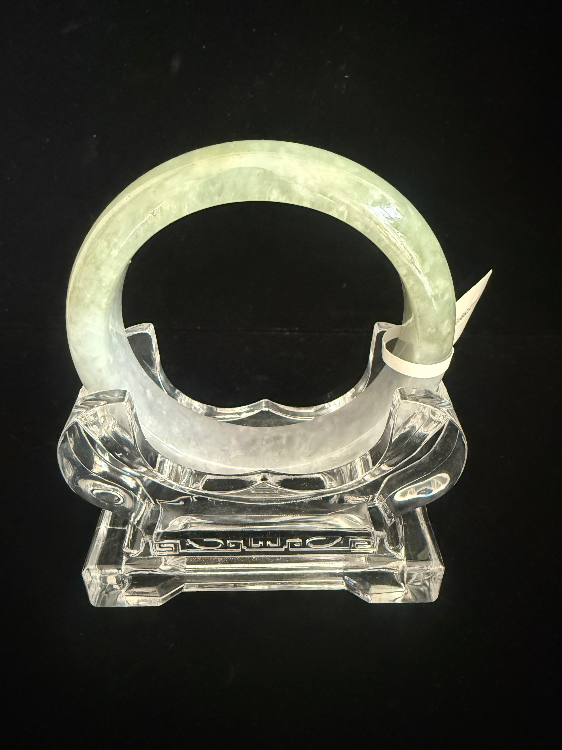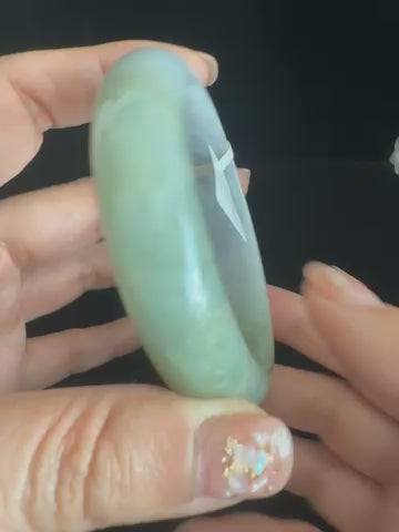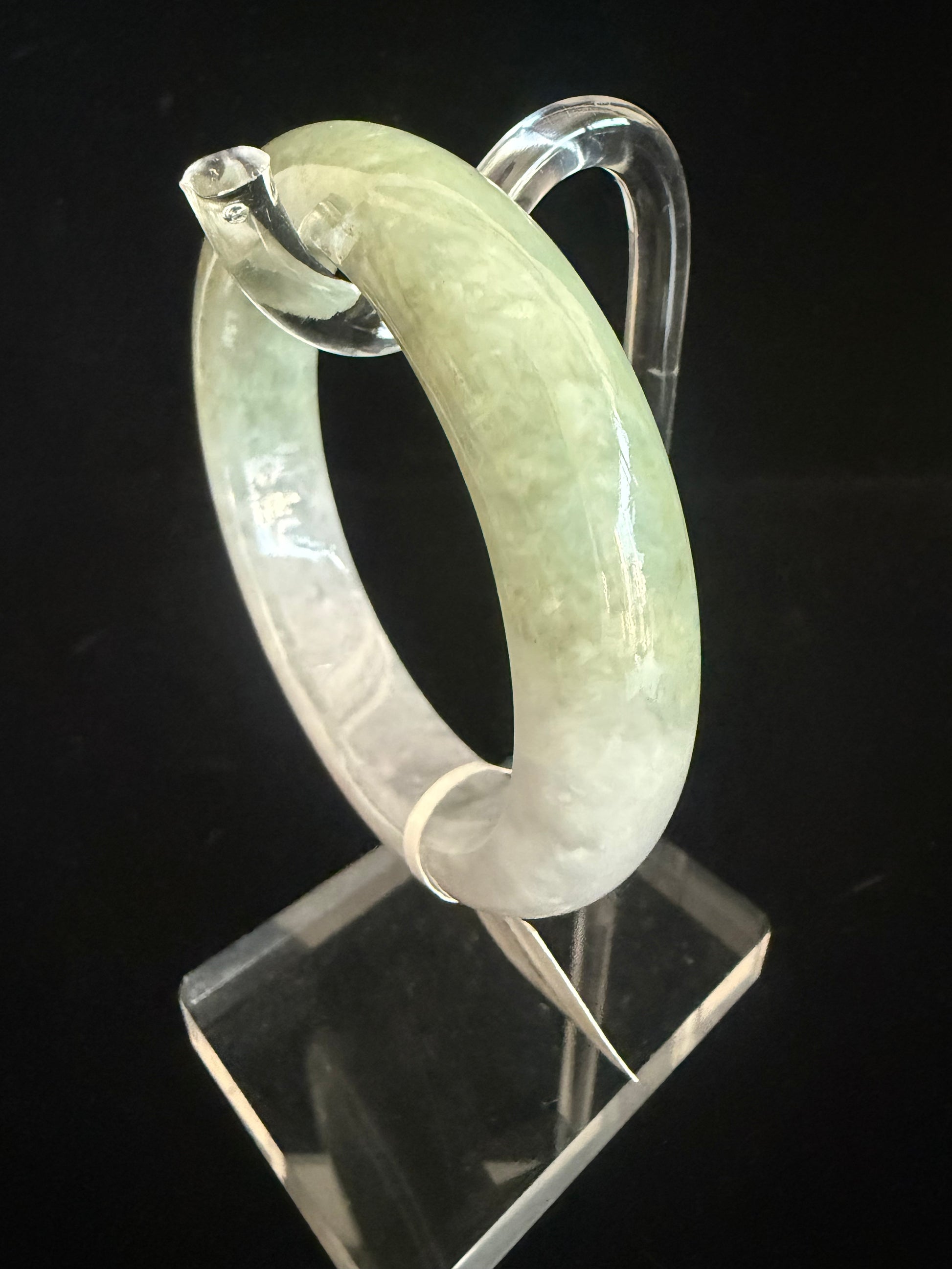 One half carries a cool, misty grey—evoking quiet strength and introspection—while the other half glows with serene lake green, reminiscent of tranquil waters and renewal. Across both tones, delicate snow cotton patterns drift like wisps of cloud, adding a dreamy, ethereal texture. Smoothly polished, the bangle feels fluid and balanced, symbolizing the union of stillness and vitality, shadow and light.