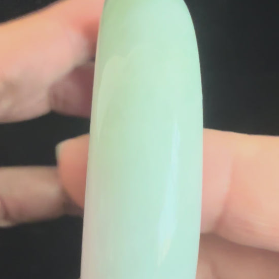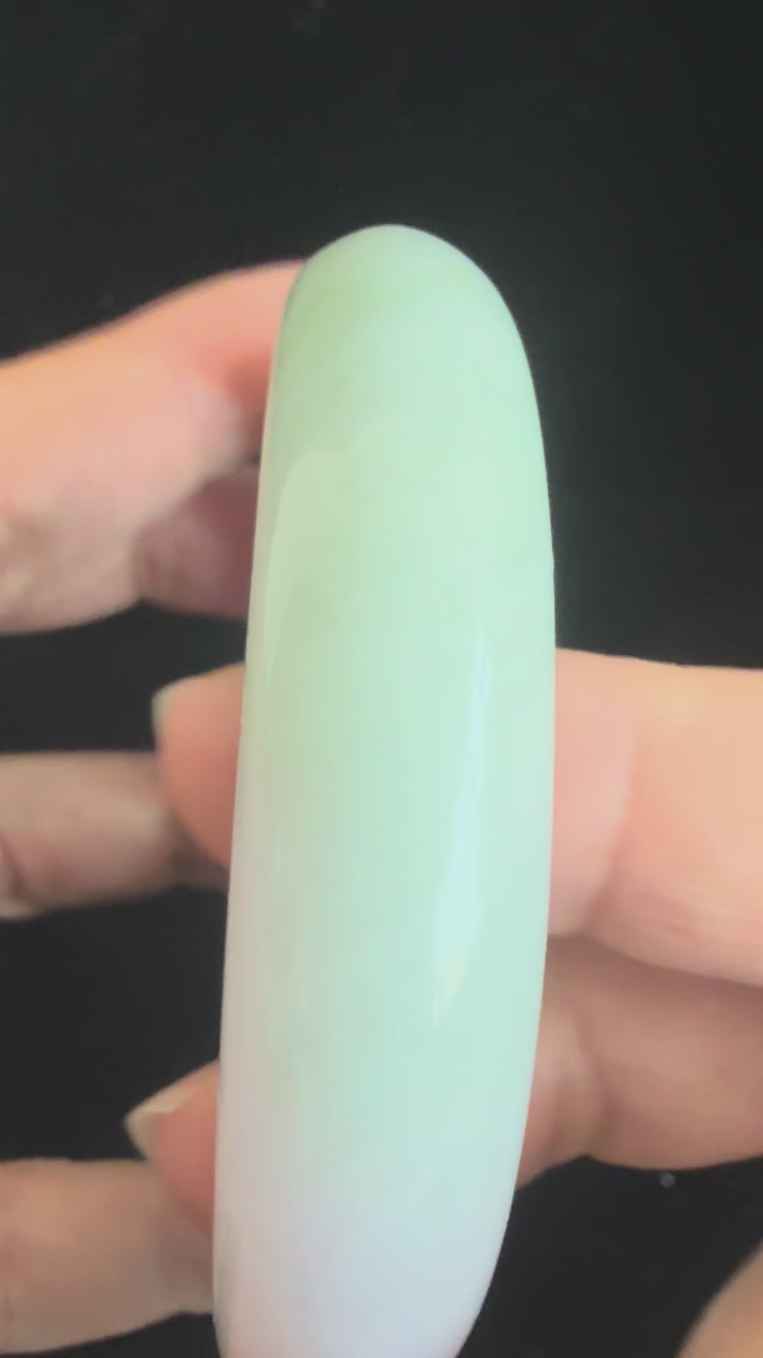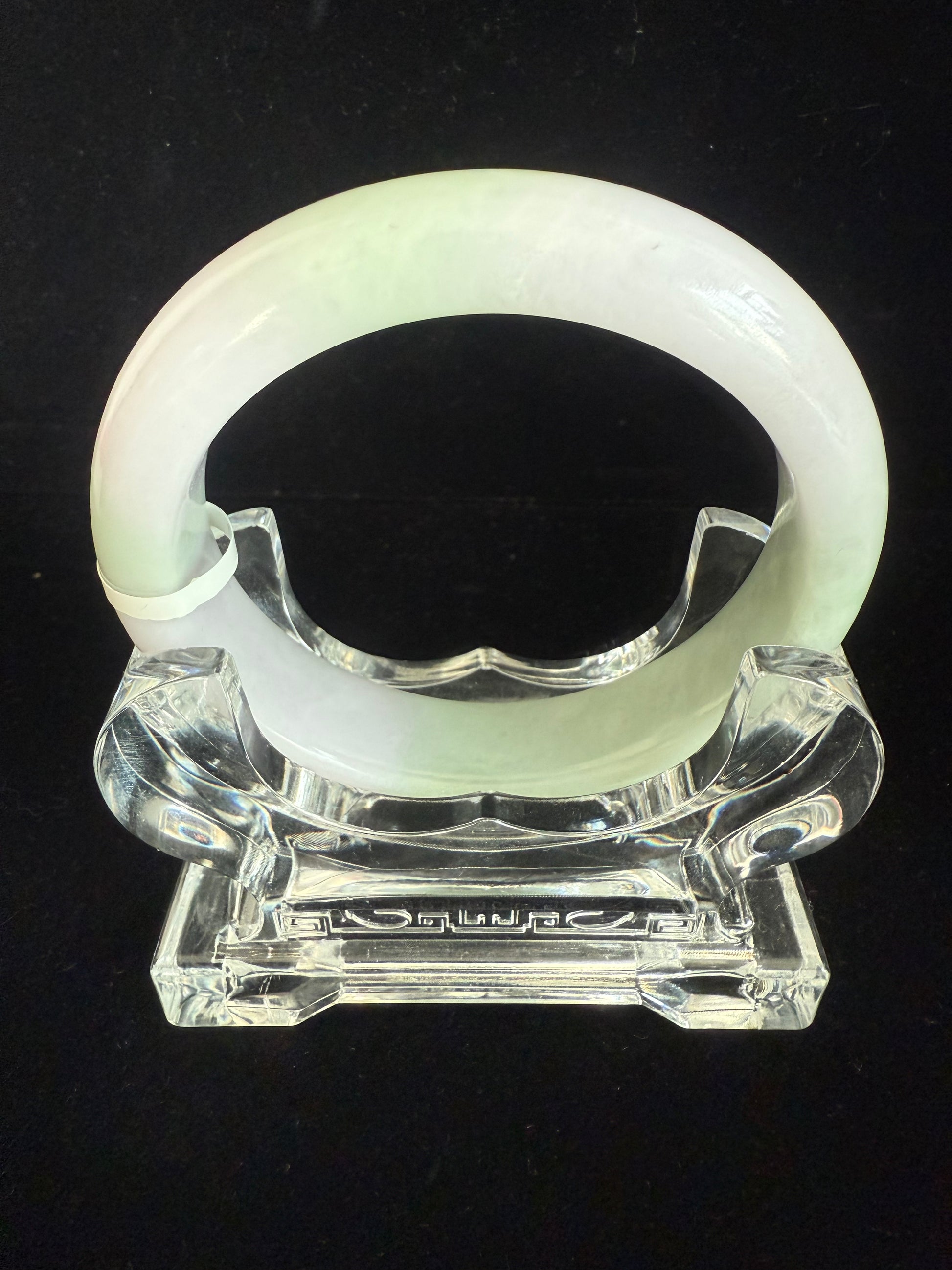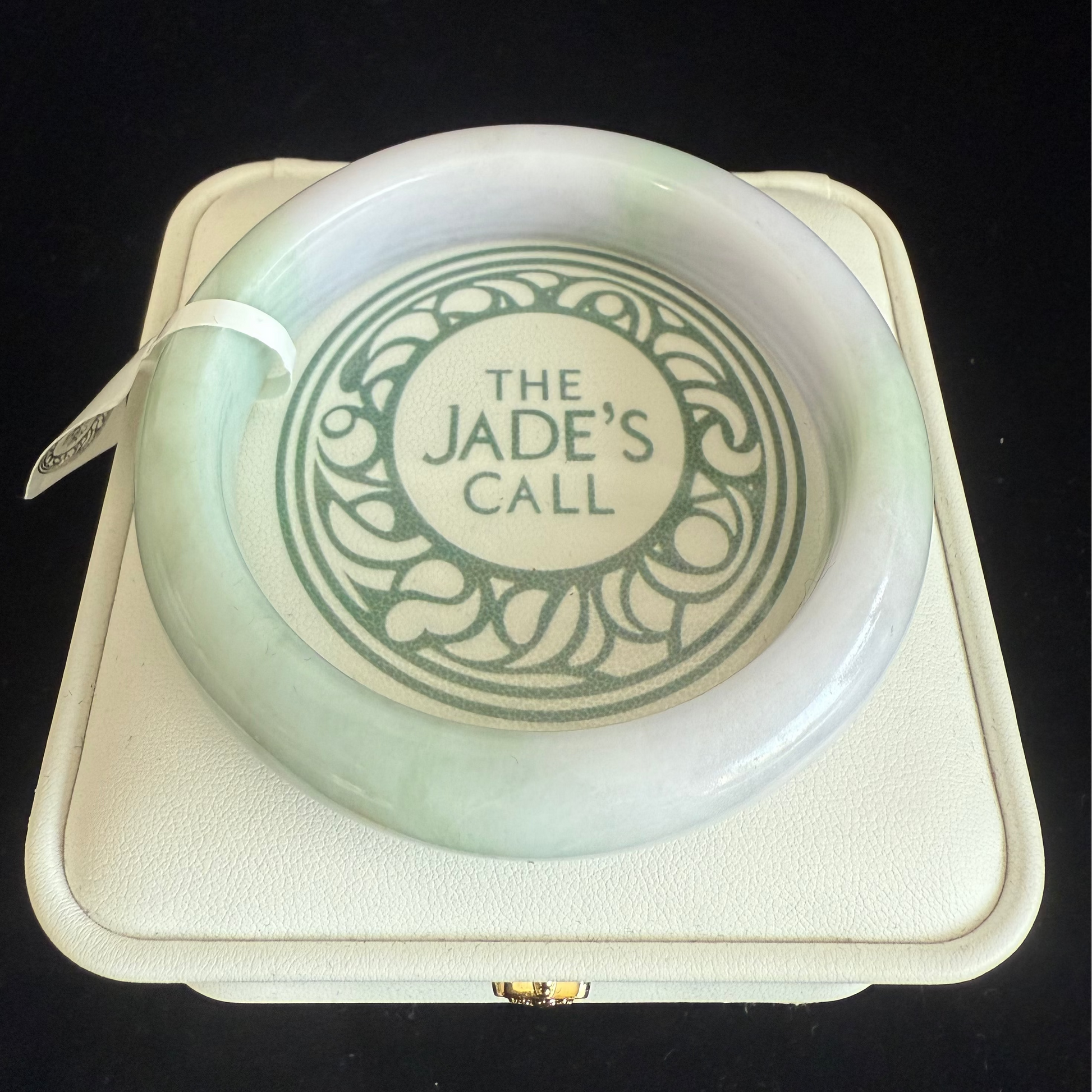 This jadeite bangle features a clean white base naturally blended with soft light green tones, creating a fresh and harmonious look. Its surface is smooth and flawless, with no visible marks, giving it a pristine and elegant presence. The simplicity of its design highlights jade’s natural purity, making it a timeless piece for those who appreciate understated beauty and refinement.