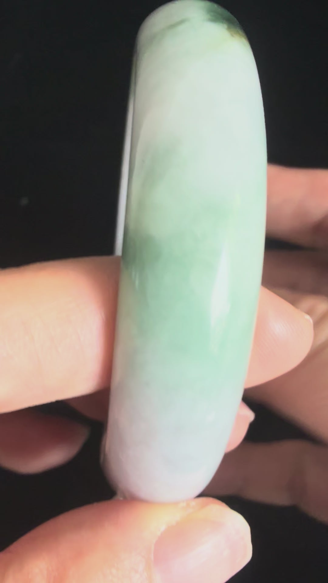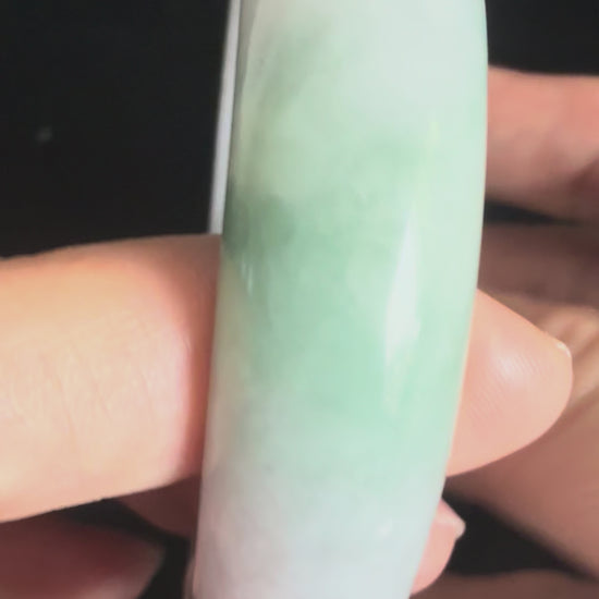 This jade bangle is alive with movement, its surface adorned by graceful swirls of green that ripple across a lighter base like flowing currents of nature. The patterns create a sense of depth and harmony, each swirl a unique signature of the stone’s natural artistry. Elegant yet organic, it embodies jade’s timeless symbolism of balance and vitality—an accessory that feels both serene and dynamic, perfect for those who treasure individuality in every detail.